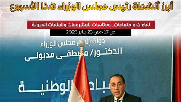 نشر المركز الإعلامي لمجلس الوزراء عددًا من الإنفوجرافات عبر منصاته على مواقع التواصل الاجتماعي، استعرض خلالها أبرز أنشطة الدكتور مصطفى مدبولي، رئيس مجلس الوزراء، خلال الأسبوع الجاري من 17 إلى 23 يناير 2026، والتي شملت لقاءات واجتماعات ومتابعات للمشروعات والملفات الحيوية. وشملت الأنشطة عقد رئيس الوزراء
